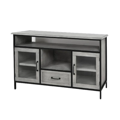 - Cabinet has two doors, one drawer, one open middle shelf, and one open top shelf.
