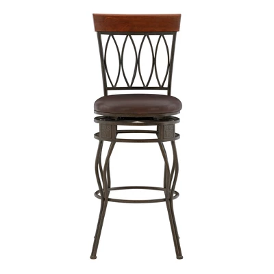 The elegance and unique style of this 30″ Four Oval Back Bar Stool will carry throughout your kitchen, dining, or home pub area. Crafted of metal and highlighted with subtle curves and a distinctive Four Oval back, this stool is a positively striking addition to your home. The cushion is piled high for extra comfort, and the chocolate wipe clean vinyl seat is pliable and resistant to everyday wear and tear, making this stool versatile for any gathering area. 275-pound weight limit.