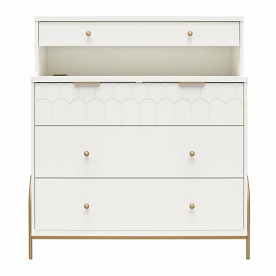Say hello to the fun and *very* flirty Anastasia Collection from CosmoLiving by Cosmopolitan. Because yes, you need this in your life! Bursting with personality, this refreshing collection features creamy white finishes with playful scalloped details, accented by brassy gold hardware and curvaceous rounded metal legs. The 4 Drawer Dresser Hutch is the perfect bedroom piece providing divided compartments in the top drawer for all that glitters, and a seriously convenient wireless charger beneath the hutch. Three larger drawers give ample space for organizing your favorite fits. Did we mention, the ultra-durable MDF and powder-coated steel construction of this dresser can stand the test of time without depleting your bank account? Treat yourself to this and many more on-point pieces from CosmoLiving by Cosmopolitan for a fiercely coordinated look. (each sold separately)