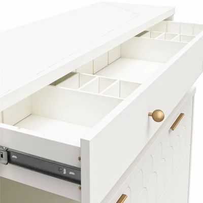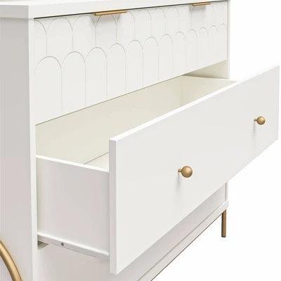 - Featuring creamy white finishes with playful scalloped details accented by brassy gold hardware and curvaceous rounded metal legs