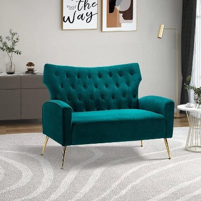This loveseat chair will provide a fresh and pleasing look to your space and will be the center of attention with tufted design. The medium density foam filling with a sturdy wooden frame provides comfort and support. Shown in a beautiful velvet upholstered fabric, this chairs sleek lines, comfortable for skin touch, and features an on-trend solid hue thats bound to blend in with your color scheme. The subtle button-tufted details dot the elegant curved wing back cushions for a dash of distinction. Contemporary metal legs and a linear profile lend itself to serene comfortperfect addition to small spaces. This small loveseat sofa for you and your loved one brings the soft and warm enjoyment at home. Whether you are looking for an intimate conversation with loved one or a place to stretch out in style, you will be well covered. This loveseat will have no problems blending into your home decoration with its natural and modern style and incredible durability. It’s the perfect pick for bedroom, living room and other scenes.Item Size: 47.5″Wx31″Dx37.5″H,Seat Size:40″Wx21.5″Dx18.5″H.