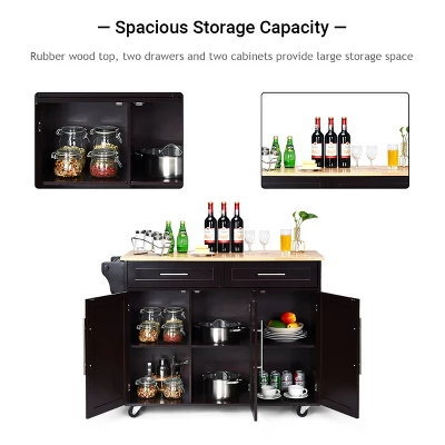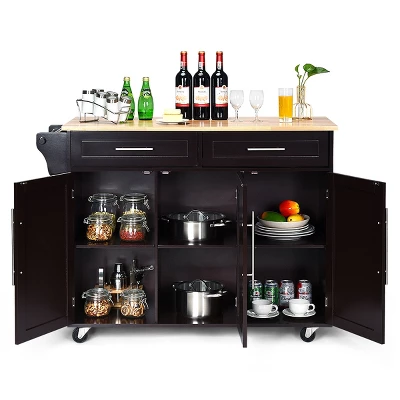 This is our kitchen trolley cart which is an excellent addition for your kitchen or dining room. Constructed of high quality MDF boards and solid rubber wood top, the kitchen trolley cart is sturdy and durable enough for long time use. Featuring two drawers, a knife block and two large cabinets with adjustable shelf, this rolling kitchen cart will meet your different needs for storing and make a good use of space. A convenient handle makes it more effortless for push or you can use it as a towel rack. 4 universal wheels ensure you can move it smoothly and silently, and two of which have brakes for safe use. What’s more, simple and elegant appearance blends perfectly with most decorative styles!