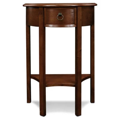 This soft silhouette is perfect for that tight area in a hallway or stair landing. Go ahead and brush by there are no corners to bump. A single drawer with blackened metal pull hardware for the things you don’t want to see and a lower display shelf for the things you do.