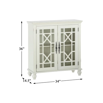 The addition of functional storage space to any home is always welcome. The Eliza Collection provides classic accent to your home’s décor while meeting your storage needs. The modern traditional design of the cabinet features behind door shelving, turned support feet, white finish, interwoven decorative mixed media glass and wood doors, and antiqued brass hardware. Also available in black and gray finish.Features : Made of wood and engineered woodAntique white finish2 cabinet doors with glass inlays1 interior shelfAntique brass tone mock key knobs with back plateNo assembly requiredSpecifications : Product Dimensions : 36.00″ H x 34.00″ W x 14.50″ DShelf Dimensions : 28.5×12.5×14.25 (2)Product Weight : 72 lbs