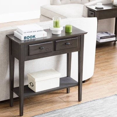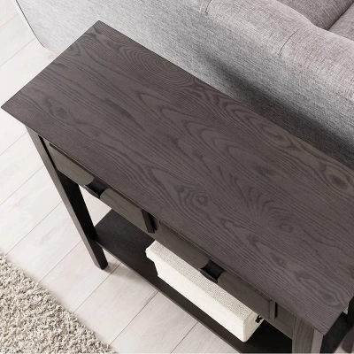 At only 10″ deep, this space saving design dares to go where no furniture has gone before. Brushed nickel, bullet pull hardware adorn the two solid wood drawer fronts. Foyers, hallways, landings are all places ready for a finishing touch with this highly versatile design in an edgy, Smoke Gray finish.