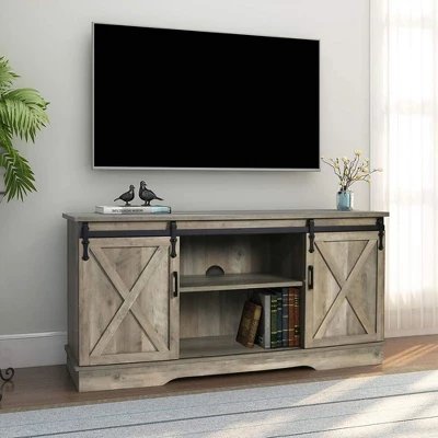 Give your TV the best seat in the house with the GHQME 58-Inch Sliding Barn Door Wooden Farmhouse Universal TV Stand Table. This stand is the perfect blend of style and function, aesthetically displaying your television while creating storage space for all your entertainment needs. Made of sturdy high-quality wood and featuring a sliding barn door cabinet front, this stand brings a touch of rustic charm to your house. Show off your DVD collection or set up video gaming consoles on the adjustable, spacious shelves. Cutouts in the back of the stand allow access to outlets so you can easily plug in your devices while keeping things tidy and cables untangled. Including all the necessary parts and hardware for assembly, the straightforward instruction manual makes assembly easy and hassle-free.Elevate your decor as well as your television set with the stylish and durable GHQME 58-Inch Sliding Barn Door Wooden Farmhouse Universal TV Stand Table.