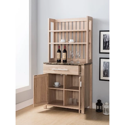 Update your kitchen with the elegant faux marble baker’s rack in weathered sand. Airy slat brown finish wood construction gives their piece a rustic touch while its spacious open shelves and double door cabinet leave plenty of space for organizing your kitchen. The faux marble top adds a contemporary touch.