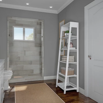 The 5-Tier Freestanding Ladder Bookcase from Hastings Home offers 5 levels of multifunctional display and storage space that can be used in any room of your home. Featuring a sturdy MDF wood construction, five 22-inch-long shelves, and 13-inches between each shelf, there are an unlimited number of ways to arrange your favorite books, photos, and decorative accents to attractively enhance your décor. The leaning style shelving unit has a straight back frame so it can stand on its own for versatile placement around the home or office.5-tier bookshelf with a straight back frame so it can stand on its own for versatile placementEach of the five shelves are 22-inches wide with varying depths for a ladder style lookWith 13-inches between each shelf, you can arrange photo frames, plants, and office supplies to enhance your room’s décorIts small footprint will maximize your storage and display space – ideal for dorm rooms, apartments, and entrywaysIncludes all hardware and tools for assembly.Materials: MDF Wood Painted in Black, Weight Capacity: Top 2 Shelves: 11lbs Each, Bottom 3 Shelves: 17.5lbs EachDimensions: (L) 23.5 x (W) 16.5 x (H) 71-inches