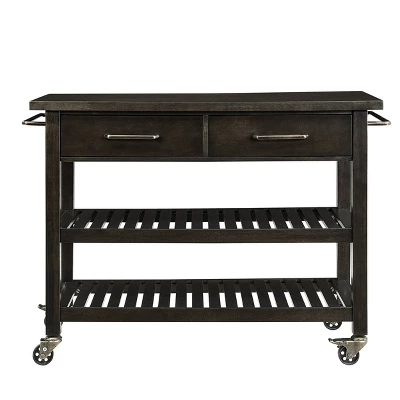 Whip it up. Put on your apron and get cooking with the Havelock Kitchen Island. Two layers of slatted shelving let you reserve dishes, pots and pans, or flatware for whenever you need them, and two storage drawers keep smaller utensils out of sight but always handy. Serve up a delicious buffet or a selection of snacks on the roomy countertop, and roll the whole unit to any room. Order up this island and make it the main course of your kitchen or mudroom.
