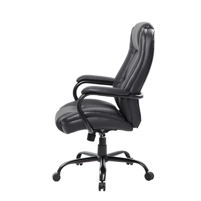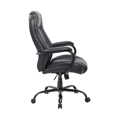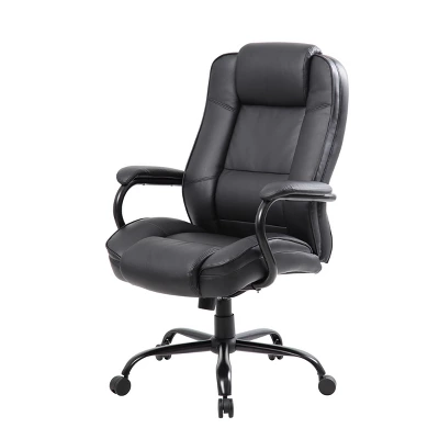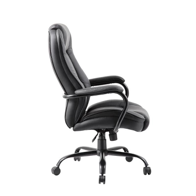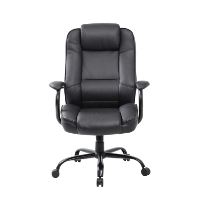 Our heavy duty executive chair is the perfect addition to any office, board room, or study. Its 400 pound weight capacity renders them compatible with a broad range of different body types. Beautifully upholstered in LeatherPlus, a durable combination of leather and polyurethane, the chair is as comfortable as it is durable. Additional features include padded arms oriented in steel wrap around style construction and reinforced lumbar support. It also features improved pneumatic gas lift seat height adjustment, and a heavy duty spring tilt mechanism.