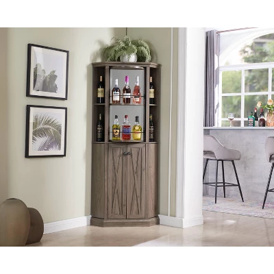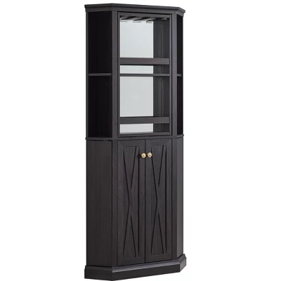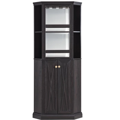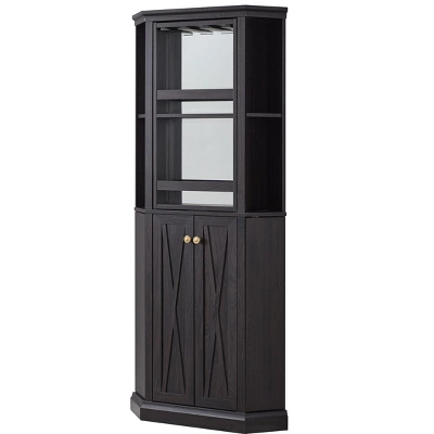 This modern home bar cabinet will bring elegance to your dining and lounge area. Designed to fit into any corner of the room to maximize space. The top shelf section has a lazy Susan spinning bar to display a wine rack or a stemware glass rack.