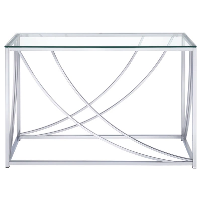 - This elegant, contemporary designed sofa table boasts a unique and stylish swoop chrome steel frame along the table sides, adding a touch of sophistication and modern flair