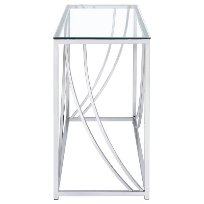 Full of clean lines and swooping curves, this modern sofa table adds depth to any living room or entryway. Bright and radiant, a shiny chrome finish dresses up the simple lines of the frame. The contemporary design of the decorative accents sets the smooth silhouette apart from the rest. Revel in the luxury and structure of the combination of a metallic base topped with glass. Create a visual focal point with the textures from this charming table.