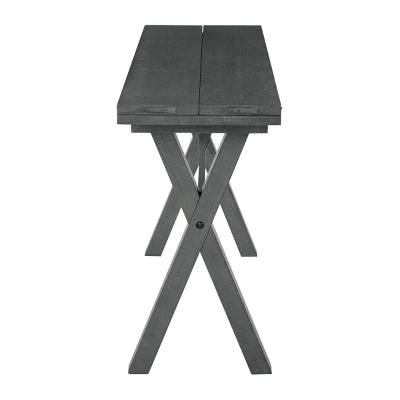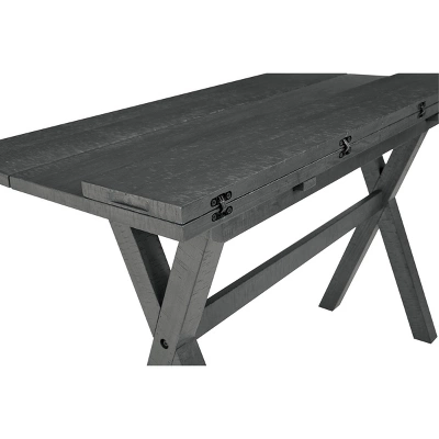 This cozy farmhouse style flip top table offers the flexibility of a casual dining table as well as a rustic table doubling as a work desk. Ideal for small spaces, the flip top opens up to reveal additional table top surface area for dining with friends or close top for a versatile console or entry table. Classic, cross beam legs provide style and pull out wood supports offer strength and stability to the flip top leaves. Our distressed chatter finish adds a homey warmth to every home. Get the farmhouse style you crave with the McKayla flip top table.