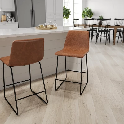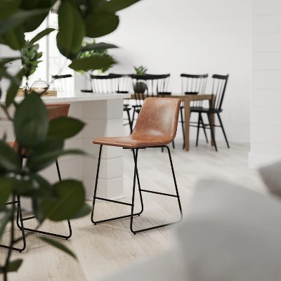 Casual elegance abounds in this set of 2 stylish counter stools for your kitchen or dining room. Richly hued dark brown faux leather upholstery gives these counter height stools a sophisticated look that easily transitions from special occasions to everyday use. Mid-back bucket style seats perched atop modern sled base metal legs along with an armless silhouette give this set a slim outline to perfectly accent you décor. Sturdy footrest bracing maintains proper posture while the padded seat and back invite you to relax and be completely present. These on-trend dining stools coordinate well with many popular interior design styles.
