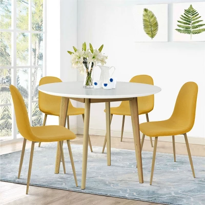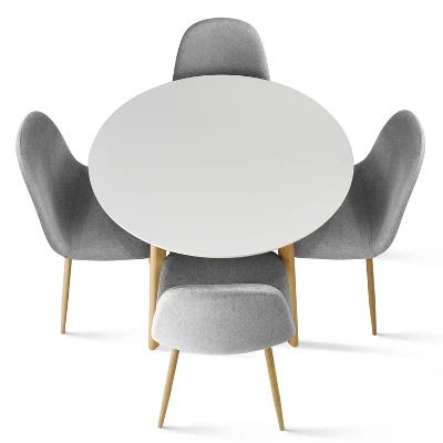 This product features a breezy look inspired by Scandinavian designs, thanks to its sleek silhouette and minimalist style. It includes four chairs and a round table. The table is crafted from solid and engineered wood, with a white top and tapered dowel legs that have a low-sheen lacquer. The chairs showcase similarly flared metal legs and a scoop-back design. They’re wrapped in polyester-blend upholstery in a solid hue that matches most styles and color schemes. This set is scratch- and stain-resistant, so they’re great for homes with pets and kids.