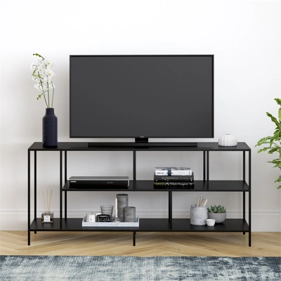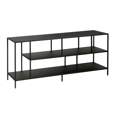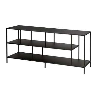 A must-have for living areas and entertainment spaces, this TV stand sets the stage for the big game, a movie marathon, or that season finale everyone’s been talking about. Crafted from steel it strikes a clean-lined silhouette and boasts a solid blackened bronze finish for a look that blends with nearly any color palette.Features : Hand crafted blackened bronze finish is applied to the steel frame.Clean with a soft, dry cloth; no harsh chemicals or abrasive cleaning materials.Features easy assembly.Accommodates most flat-screen TVs up to 55 inches. Made from premium metal and tempered glass this media console can support up to 75 LBS.Premium materials have been used in the making of this productSpecifications : Product Weight : 40.7 lbsFrame Material : Metal
