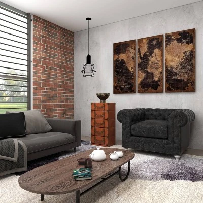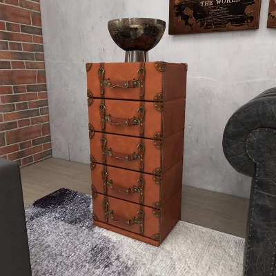 - A reddish brown PVC finish and brass stud accents highlight this storage chest