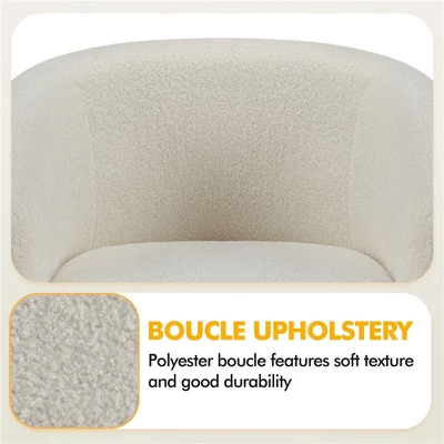 - The contemporary with traditional curved design merge for an elegant look, this boucle club chair is an inviting addition to any seating ensemble. Constructed of a manufactured wood frame, soft-to-touch boucle covering and medium-firm foam seat, this barrel chair stands out from others for its quality and comfort. The ability to hold up to 300lb provides a strong and durable seat for all ages.